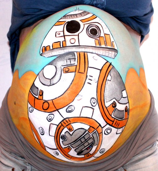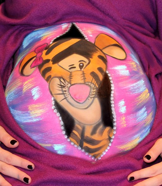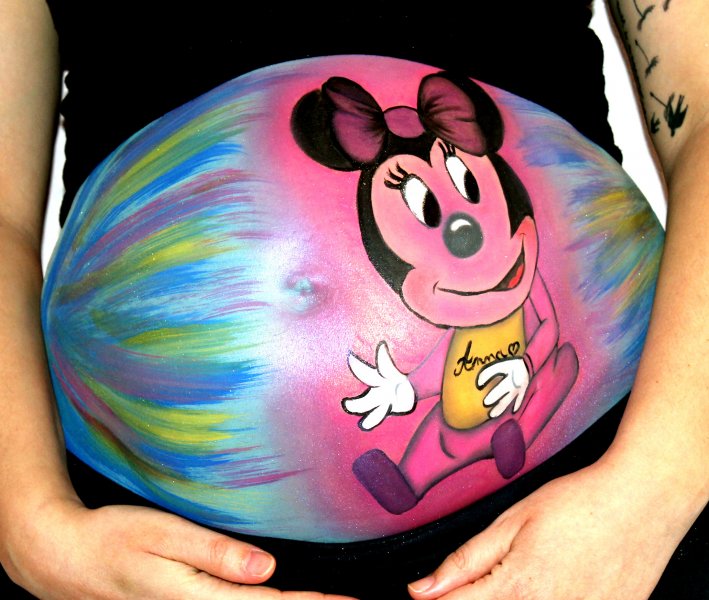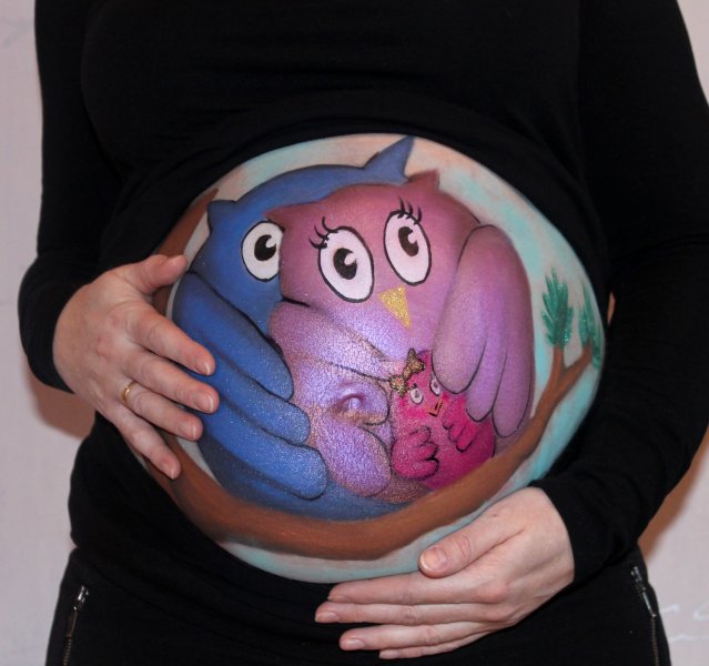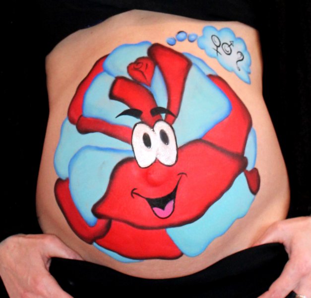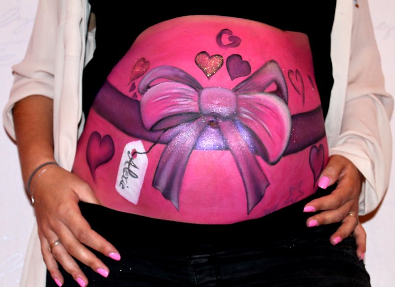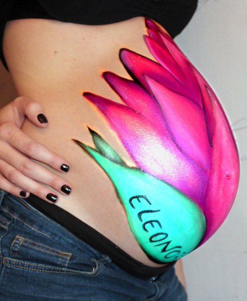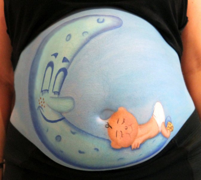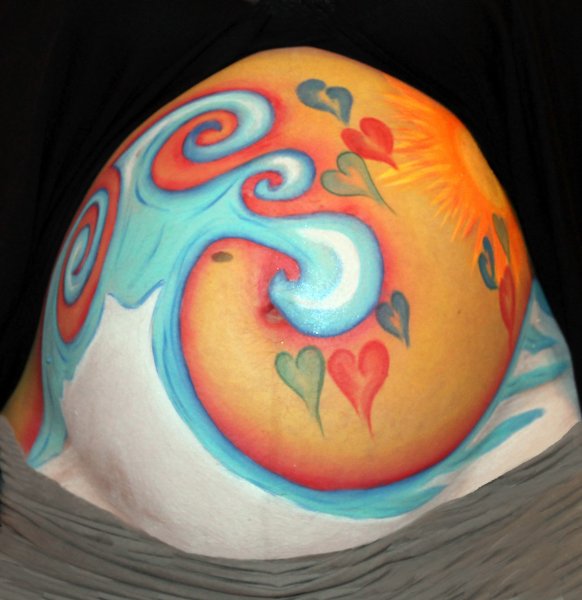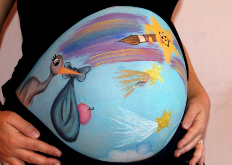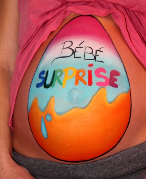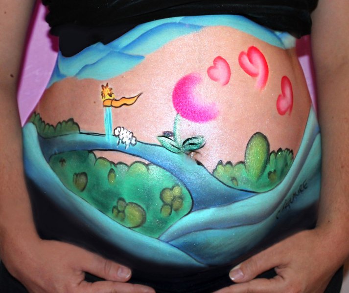 communiquer avec le Bébé, - Un maquillage artistique sur le ventre arrondi de la future maman, immortalisé par une photo.